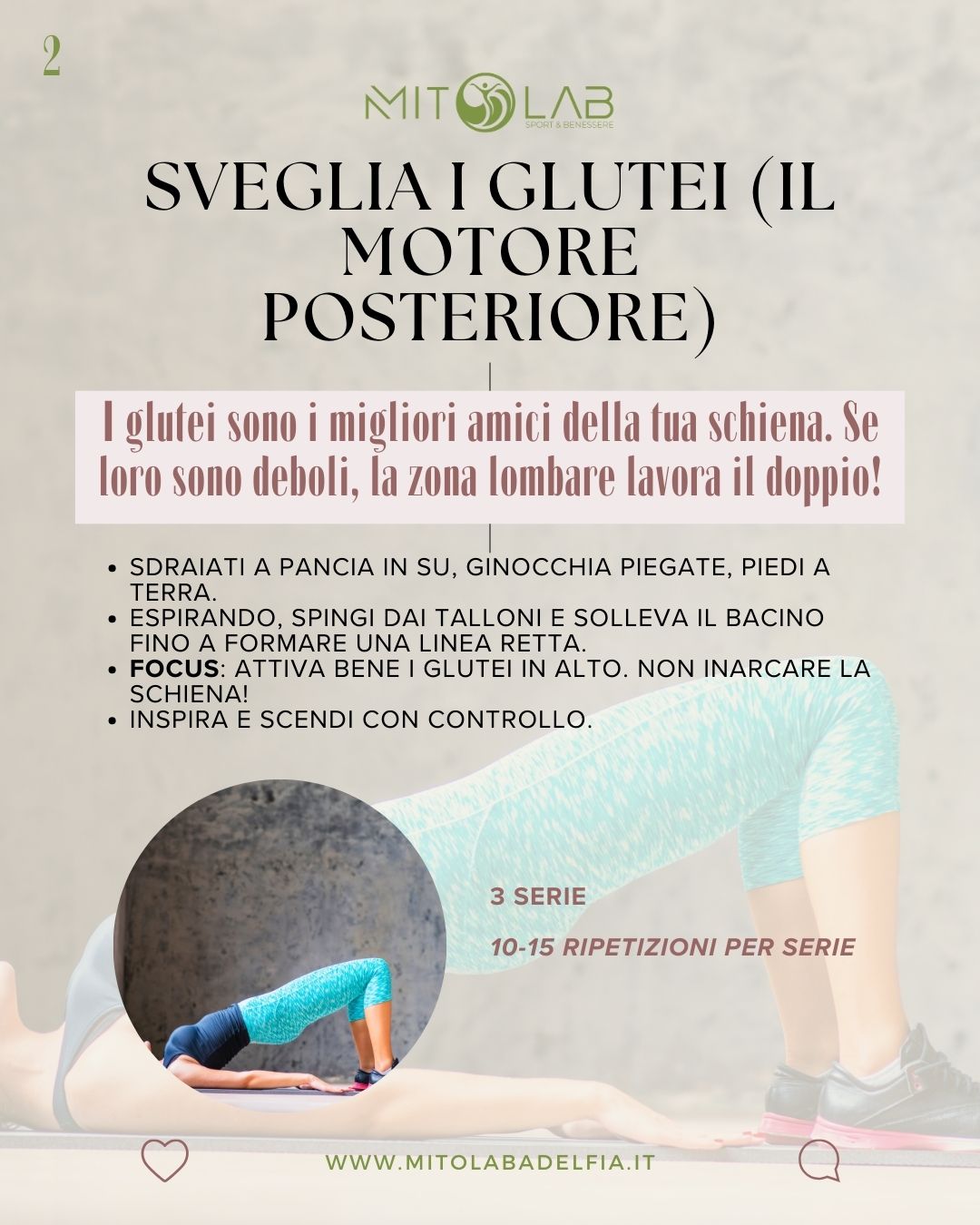• Il Segreto: Strizza forte i glutei nel punto più alto per 2 secondi. Non inarcare la schiena!