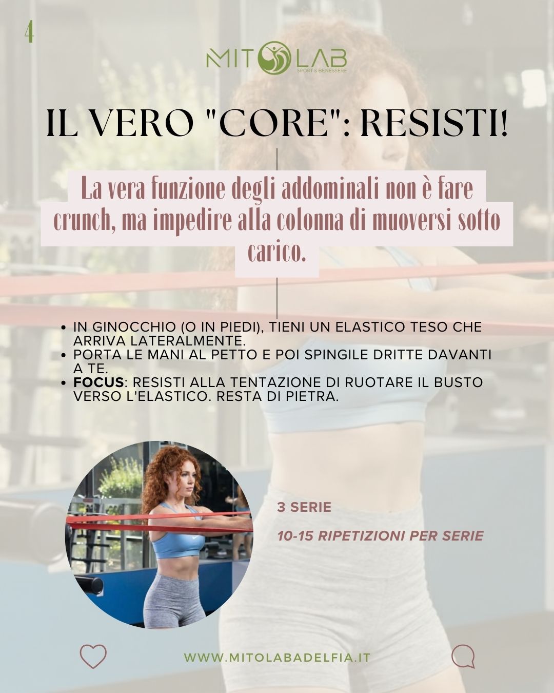 • Il Segreto: L’elastico vorrà farti ruotare il busto. Tu non glielo permettere. Resta dritto/a e controllato/a.