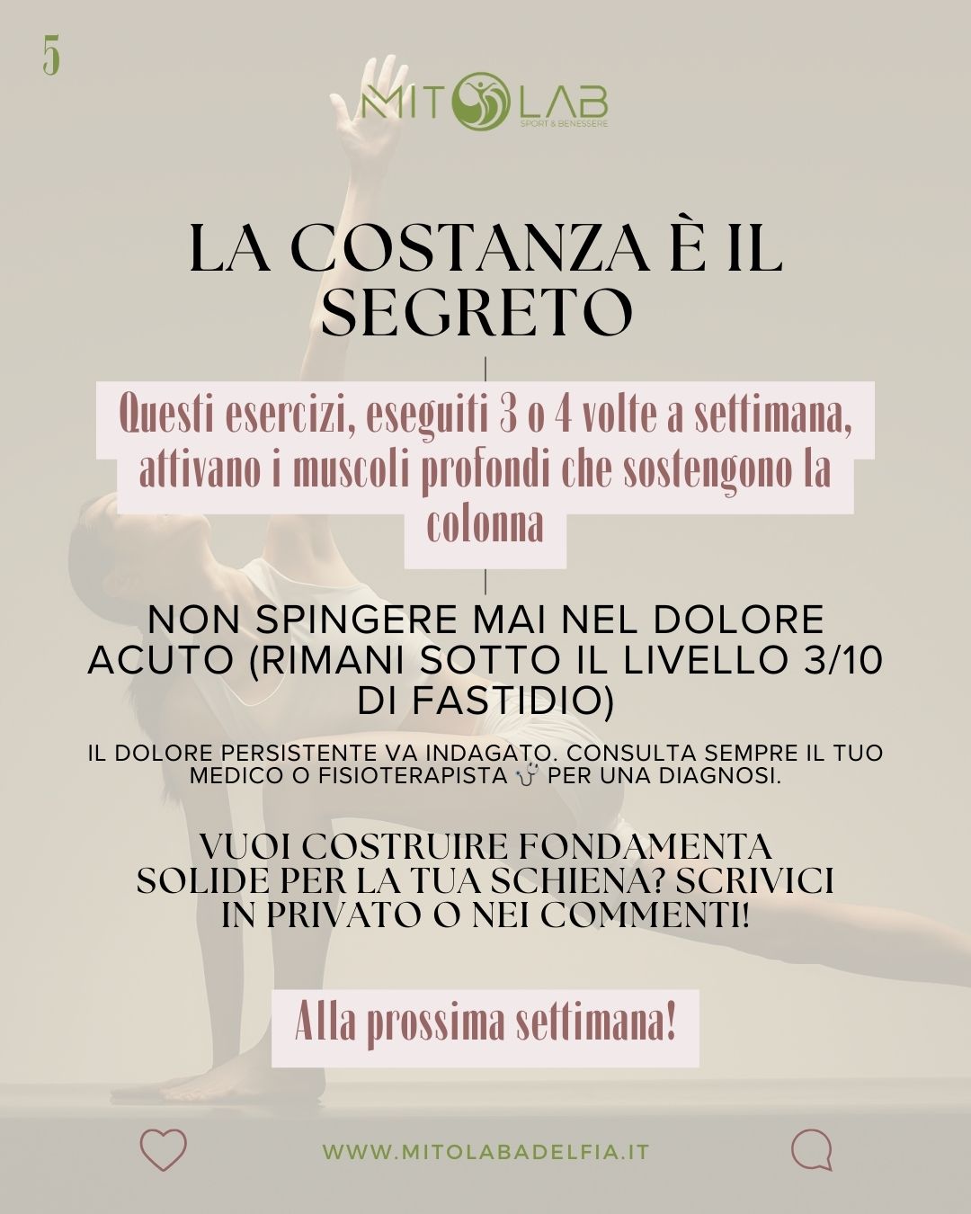 A differenza della mobilità, che può dare sollievo immediato, la stabilità si costruisce nel tempo. Questi esercizi danno i migliori risultati se eseguiti con costanza, 3 o 4 volte a settimana.